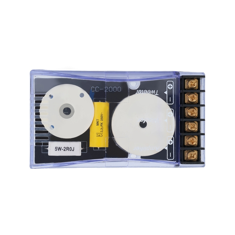 CC-2100 is a high-performance, one-channel, two-way audio crossover specifically designed for separating high- and low-frequency signals in audio systems. Suitable for a variety of in-car and home audio applications, it helps users achieve clearer and more precise audio performance. It effectively splits a single channel's audio signal into two frequency bands, allowing the tweeter and woofer to each receive their appropriate frequency range, thereby optimizing the overall expressiveness and sound balance of the speaker system. With a crossover frequency set at 5kHz, the CC-2100 accurately distinguishes between mid-bass and high-frequency signals, making it compatible with common speaker system configurations. This design helps avoid distortion caused by frequency band overlap, improving the overall sound reproduction of the audio system, and particularly delivering superior resolution when playing vocals, string instruments, or high-frequency details.