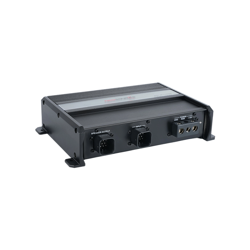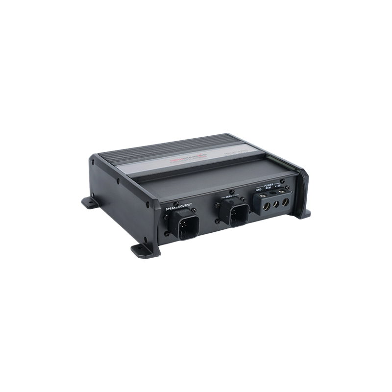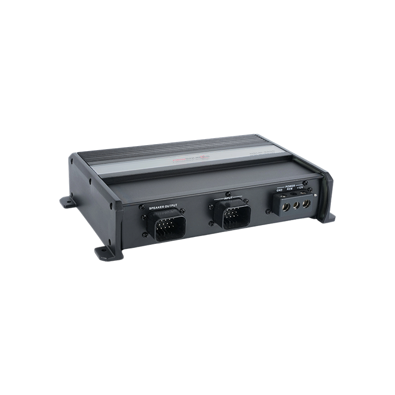 NSLM-1.1000 Mono Channel class D amplifier is designed for users who demand superior low-frequency performance in outdoor or in-car audio systems. Featuring powerful power output, a waterproof construction, and multiple protection features, it provides stable and powerful driving power for subwoofers, maintaining excellent performance even in challenging environments. It features a signal-sensing function that automatically activates upon detecting an audio signal, enhancing operational convenience. It also features remote volume control, allowing users to adjust volume to suit their environment or preferences. Utilizing TE waterproof connectors, the system achieves an IPX4 waterproof rating, effectively preventing splashes of water, rain, and other liquids from entering the system, meeting the reliability requirements of outdoor and harsh operating environments. Its compact design, measuring 245mm (width) × 160mm (depth) × 46mm (height), facilitates concealed installation or installation in confined spaces.