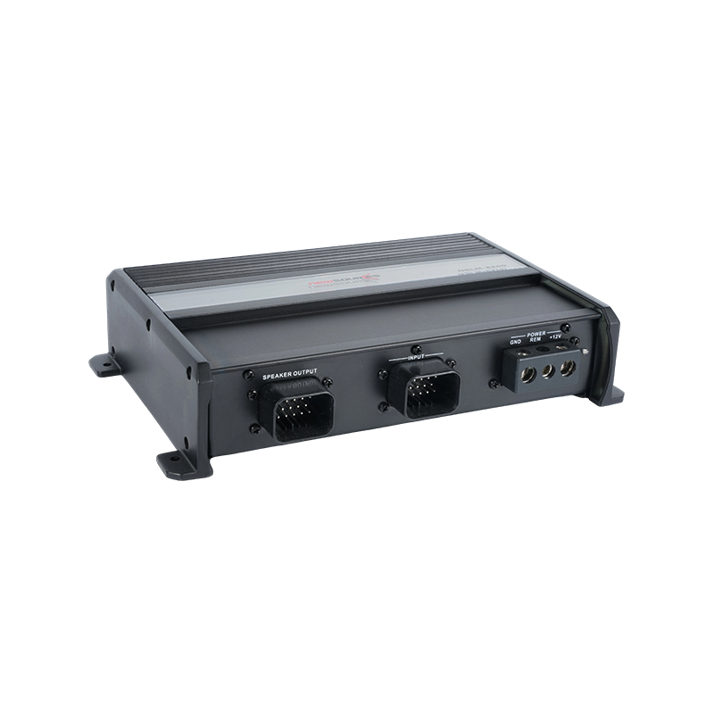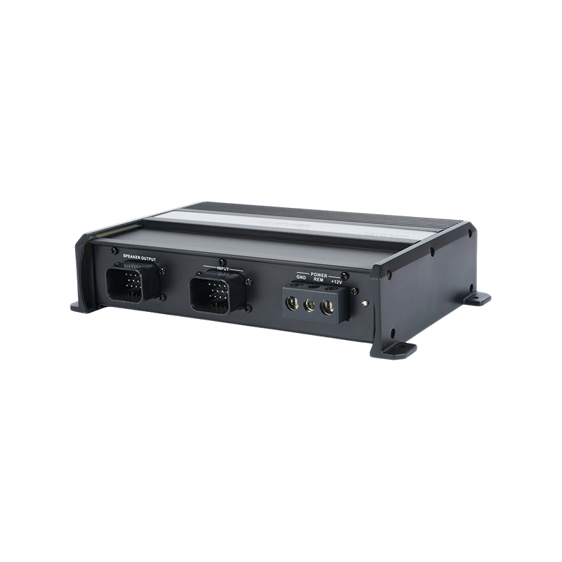 NSLM-1.1000 Mono Channel class D amplifier is designed for users who demand superior low-frequency performance in outdoor or in-car audio systems. Featuring powerful power output, a waterproof construction, and multiple protection features, it provides stable and powerful driving power for subwoofers, maintaining excellent performance even in challenging environments. It features a signal-sensing function that automatically activates upon detecting an audio signal, enhancing operational convenience. It also features remote volume control, allowing users to adjust volume to suit their environment or preferences. Utilizing TE waterproof connectors, the system achieves an IPX4 waterproof rating, effectively preventing splashes of water, rain, and other liquids from entering the system, meeting the reliability requirements of outdoor and harsh operating environments. Its compact design, measuring 245mm (width) × 160mm (depth) × 46mm (height), facilitates concealed installation or installation in confined spaces.